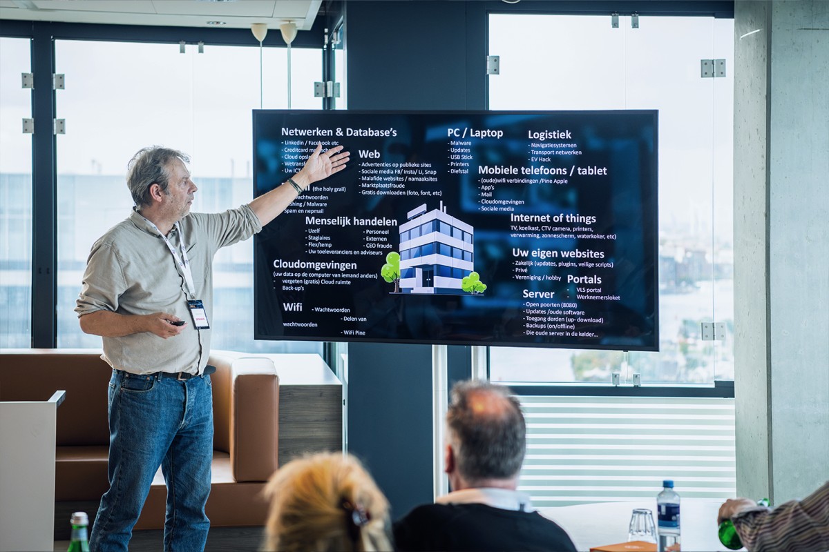 In zijn presentatie legde Hans uit dat de NIS2-richtlijn, die vanaf oktober 2024 van kracht is, organisaties in kritieke sectoren zoals energie, transport en gezondheidszorg verplicht om strengere cybersecuritymaatregelen te nemen. Hij besprak de mogelijke gevolgen van non-compliance, zoals hoge boetes en persoonlijke aansprakelijkheid voor het management.